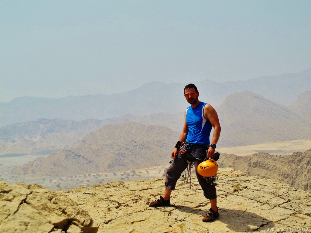 Summer trad climbing in the Emirate of Ras al Khaimah. With temperatures around 40°C, the humidity is so high that visibility is reduced on long distance