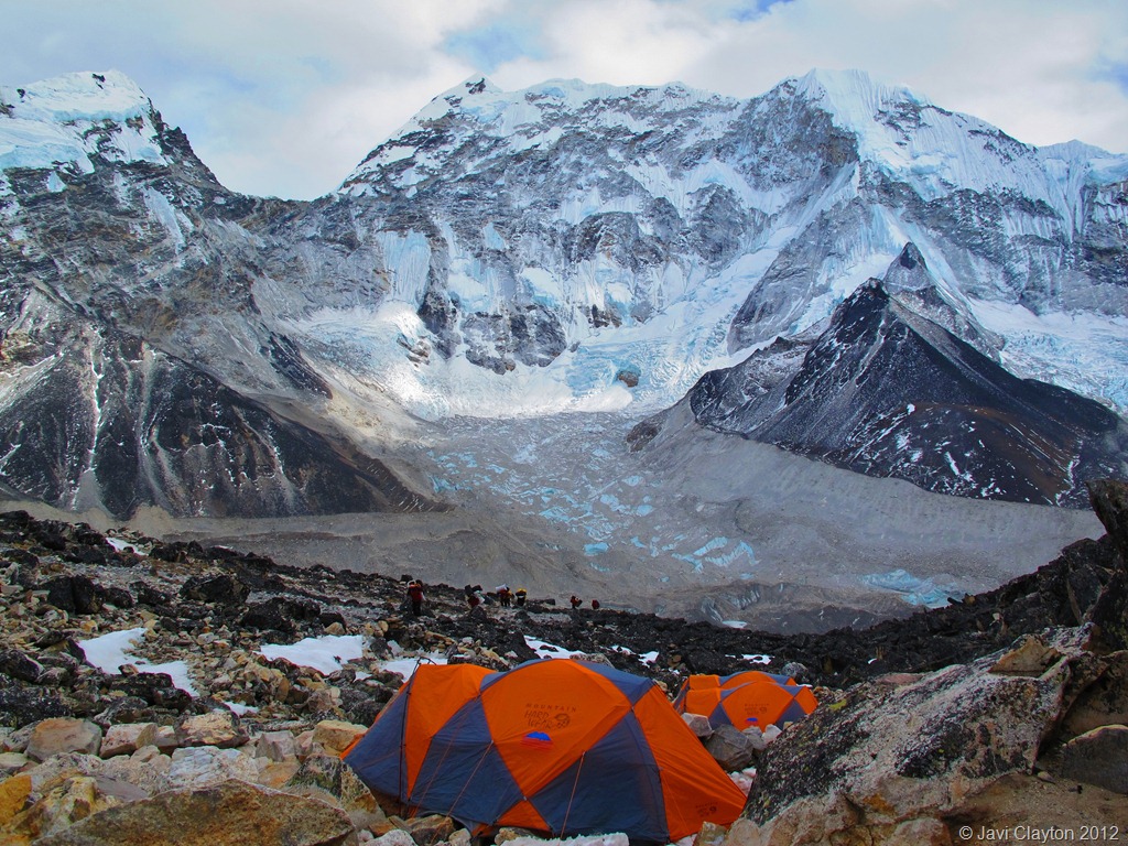 Not extremely steep glacier walk up. The last steep portion of the way is fixed with ropes. It is arguably a good idea to cross the crevassed glacier in the lower portion of the ascent using a rope, although most climbers cross this place without bothering to rope up. There is always an avalanche danger at this part. There are two possibilities to make Camp 1 – about one hundred altitude meters from one another. The upper ledge is smaller but somehow nicer. At both places there are enough dry rocky spots to make camping there pleasant. There is also an ice cave (enough for 3 people) near the upper ledge.